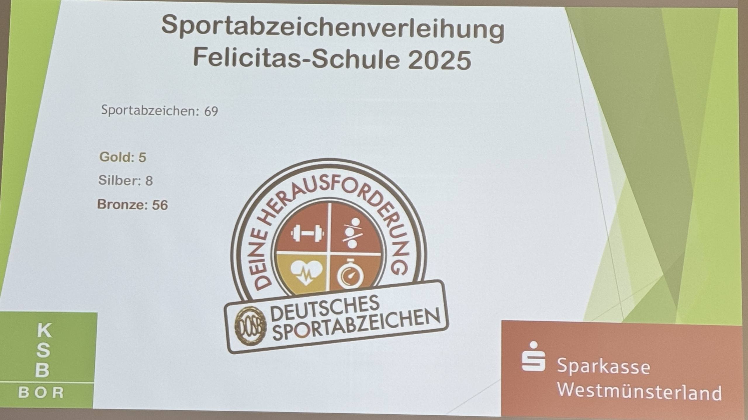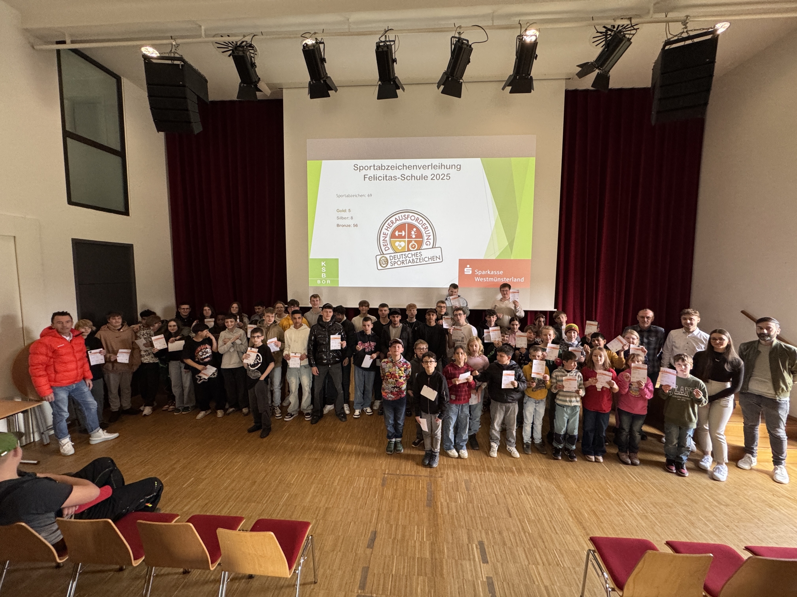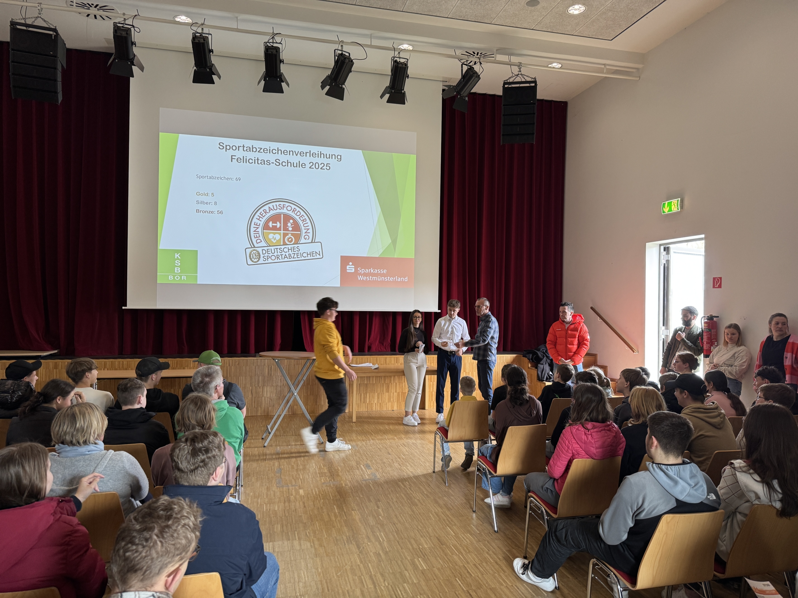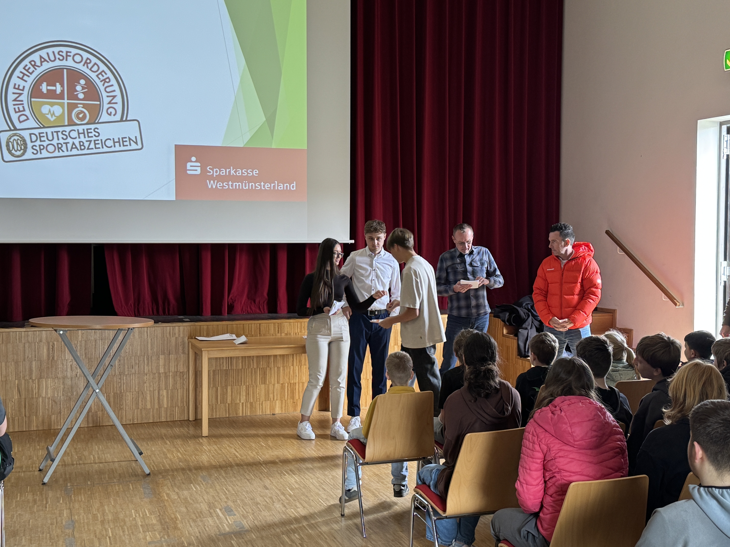 Am Dienstag fand die diesjährige Verleihung der Sportabzeichen durch den Kreissportbund Borken und die Sparkasse Westmünsterland statt. Die intensive Vorbereitung im Sportunterricht hat sich auch in diesem Jahr wieder ausgezahlt: Insgesamt konnten 69 Sportabzeichen überreicht werden – ein großartiges Ergebnis!