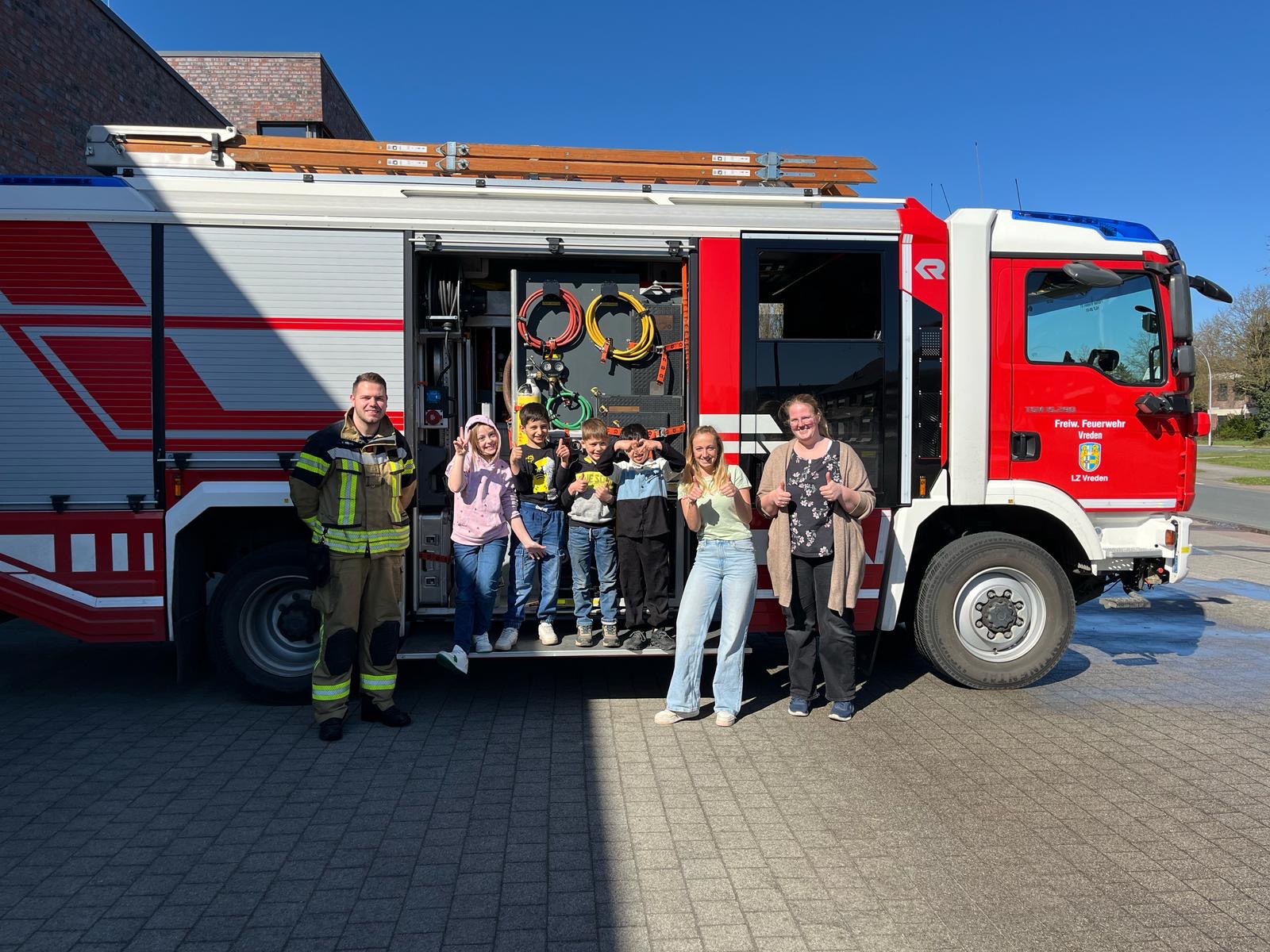 Am 07. April ging es für einige SuS der Unterstufe zur Freiwilligen Feuerwehr Vreden. Schon bei der Ankunft war die Aufregung groß – ein echtes Feuerwehrfahrzeug stand bereit und wartete darauf, erkundet zu werden. Ein Feuerwehrmann erklärte, welche Geräte sich im Fahrzeug befinden und wofür sie eingesetzt werden. Besonders aufregend war es, als die Sirene eingeschaltet wurde – ganz schön laut!