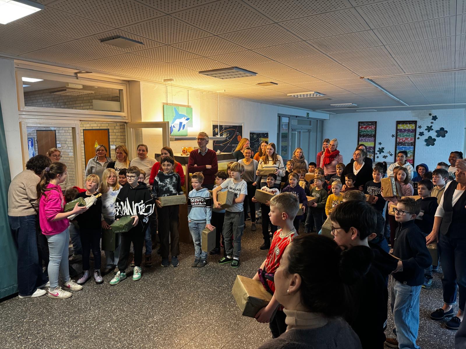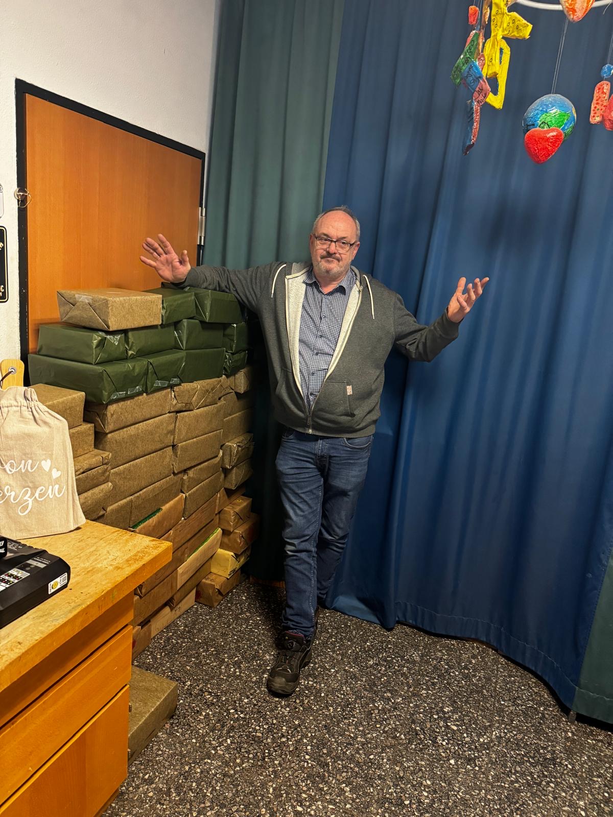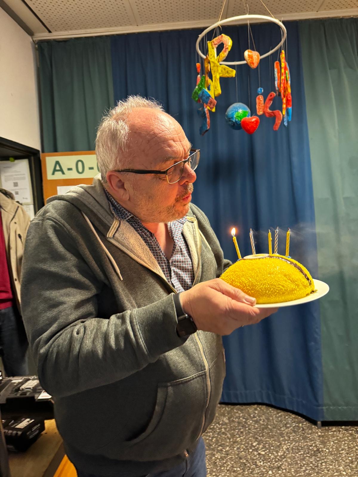 - Dienstag: Die Schüler*innen der Unterstufe erfüllten ihm einen lang gehegten Wunsch: Sie „mauerten“ sein Büro mit liebevoll gestalteten „Geschenke-Steinen“ zu – eine witzige Anspielung auf Hausis scherzhafte Ankündigung, die Tür seines Büros irgendwann unauffällig zuzumauern, um nicht mehr aufräumen zu müssen.
