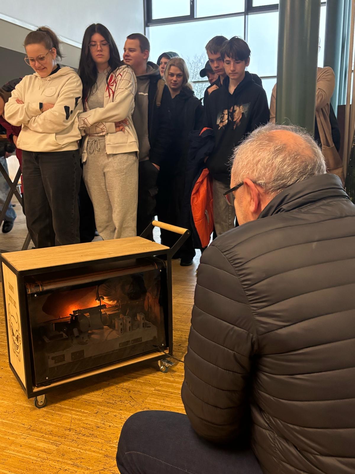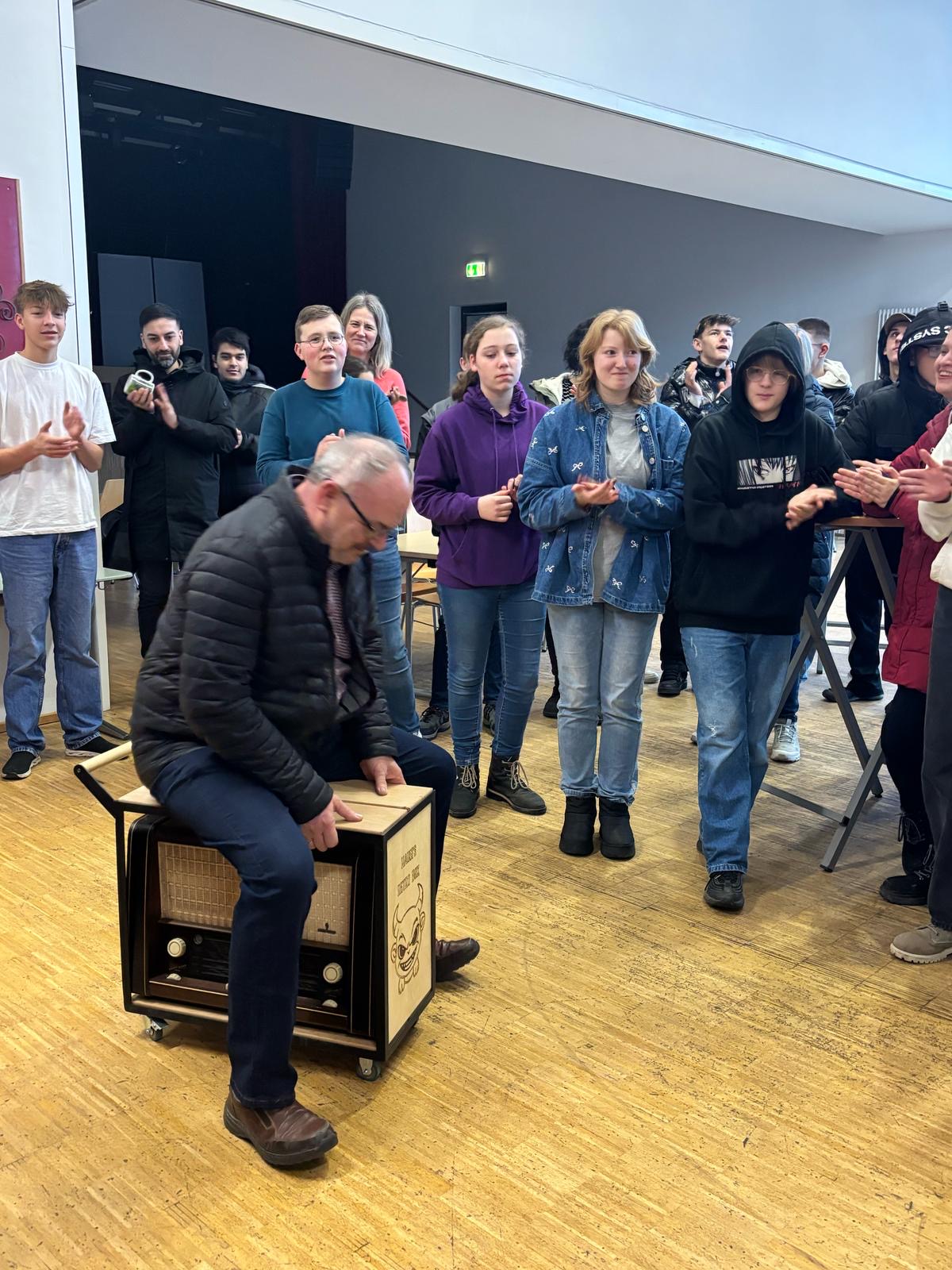 - Freitag: Der krönende Abschluss: Die Oberstufe überreichte ihm eine selbstgebaute „Teufelbox“, eine „Nachbildung“ des Originals, das er stets gut bewachte und nur selten herausgab.