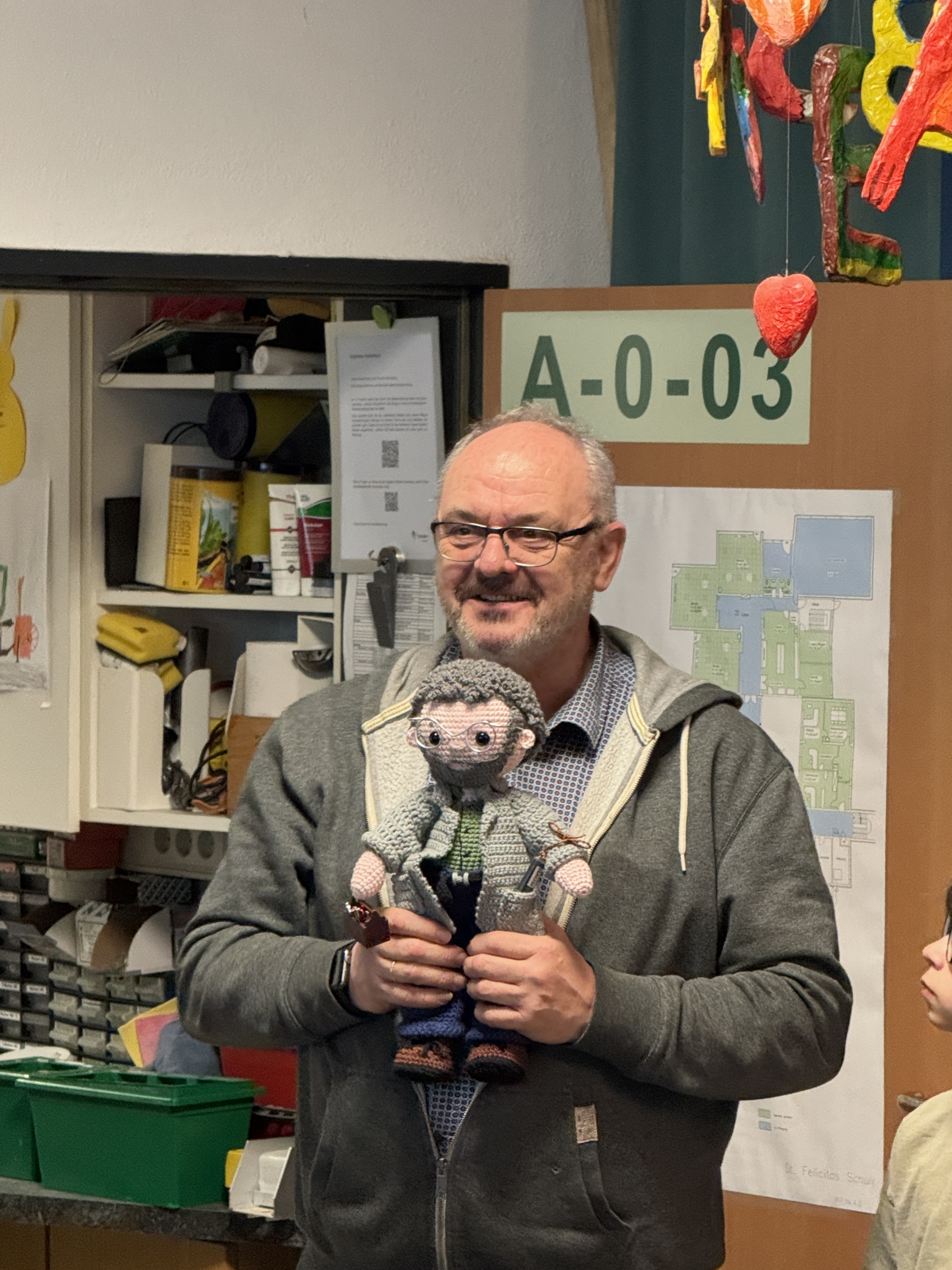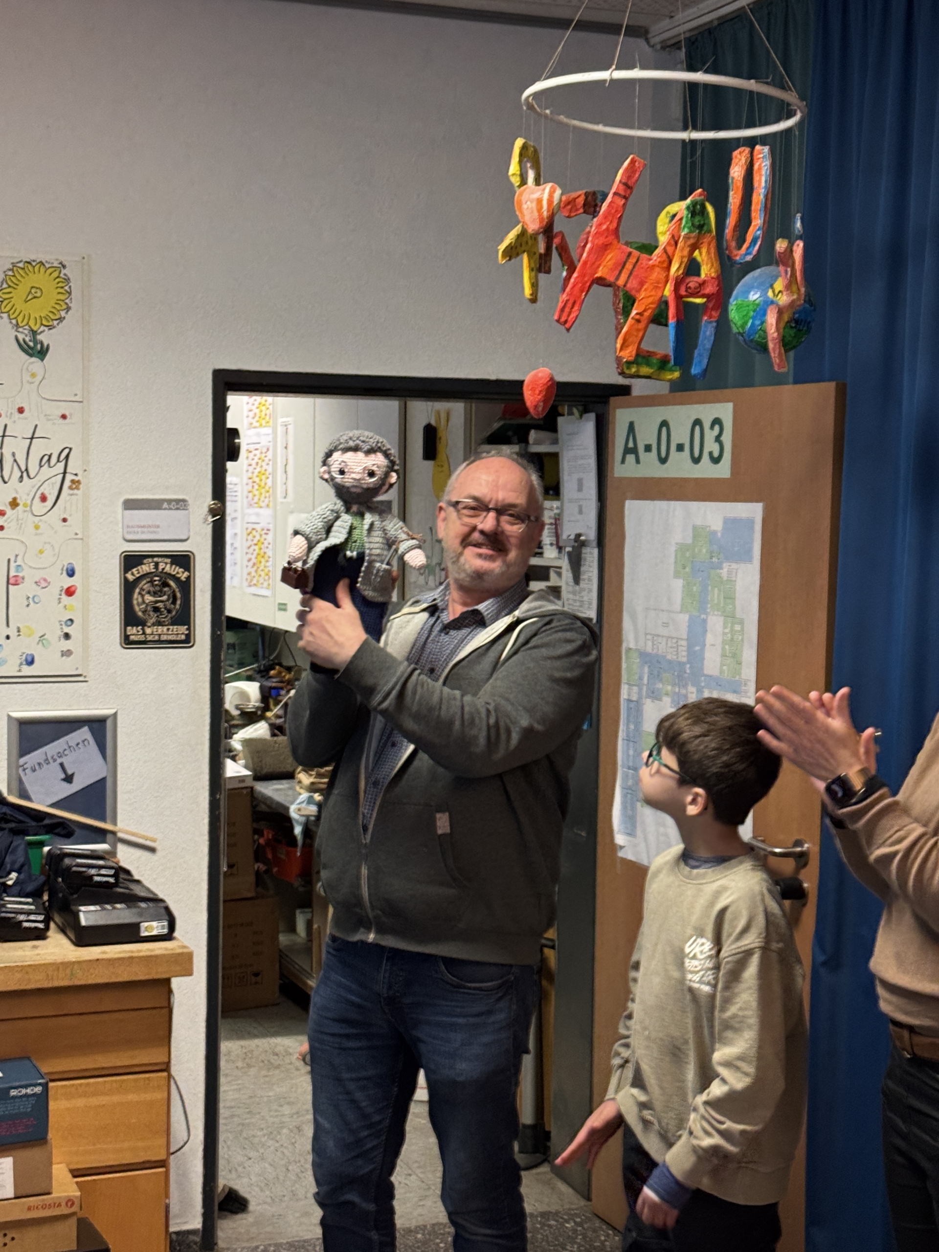 - Donnerstag: Als besonderes Andenken erhielt Hausi eine selbstgemachte Hausi-Puppe sowie ein eigens für ihn verfasstes Video von der Mittelstufe.