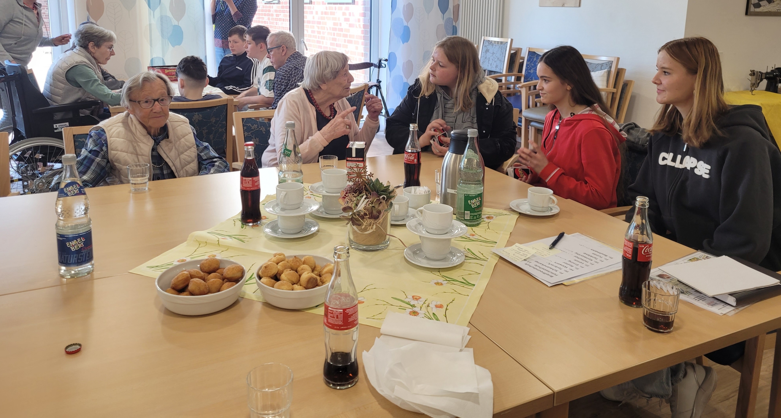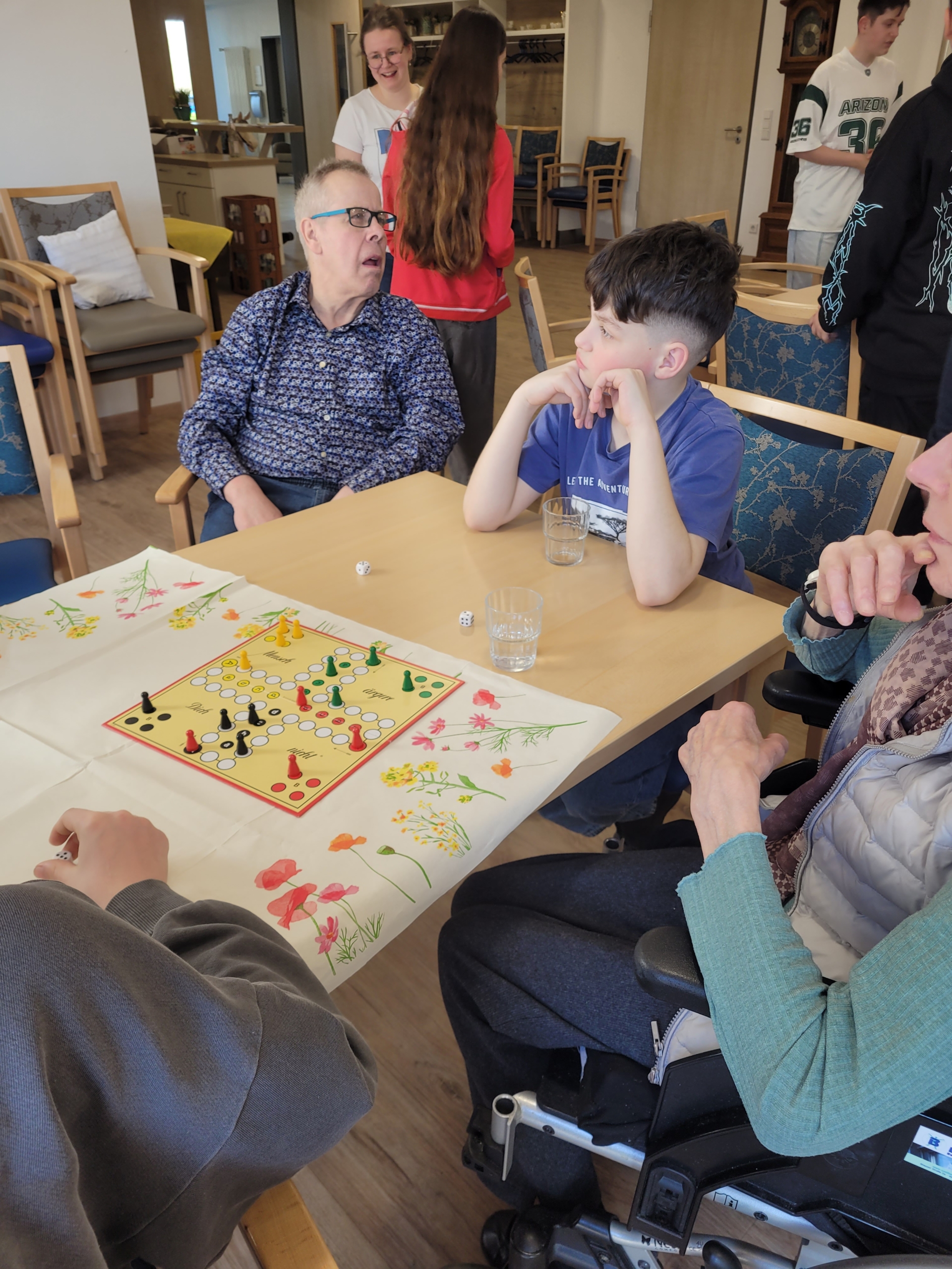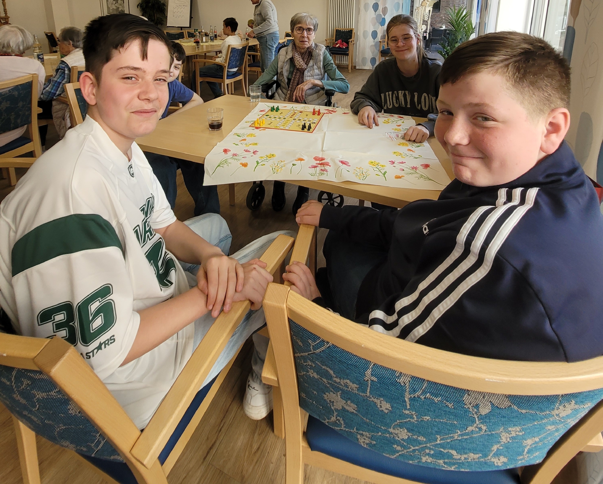 Der Höhepunkt des Projektes war dann das persönliche Kennenlernen am Freitag, den 21. März 2025 in den Räumlichkeiten des Seniorenzentrums. Die Schülerinnen und Schüler erhielten eine kleine Führung durch die Einrichtung, konnten Fragen stellen und sich im Anschluss persönlich mit ihren Briefpaten austauschen. Gemeinsam wurden Gesellschaftsspiele gespielt und es entstanden schöne Gespräche. Sowohl die Schülerinnen und Schüler als auch die Bewohnerinnen und Bewohner des Seniorenzentrums waren begeistert von dieser Begegnung.