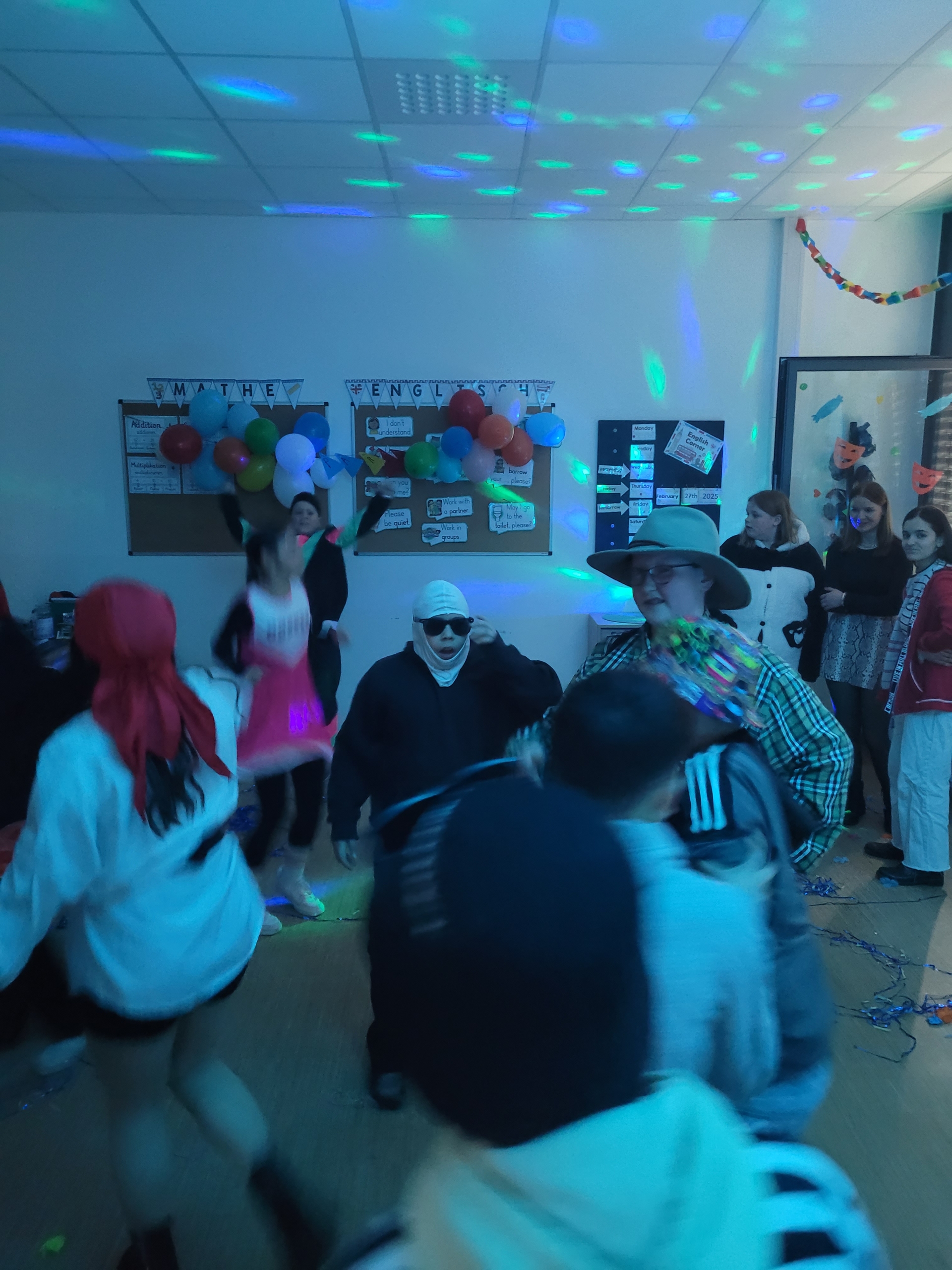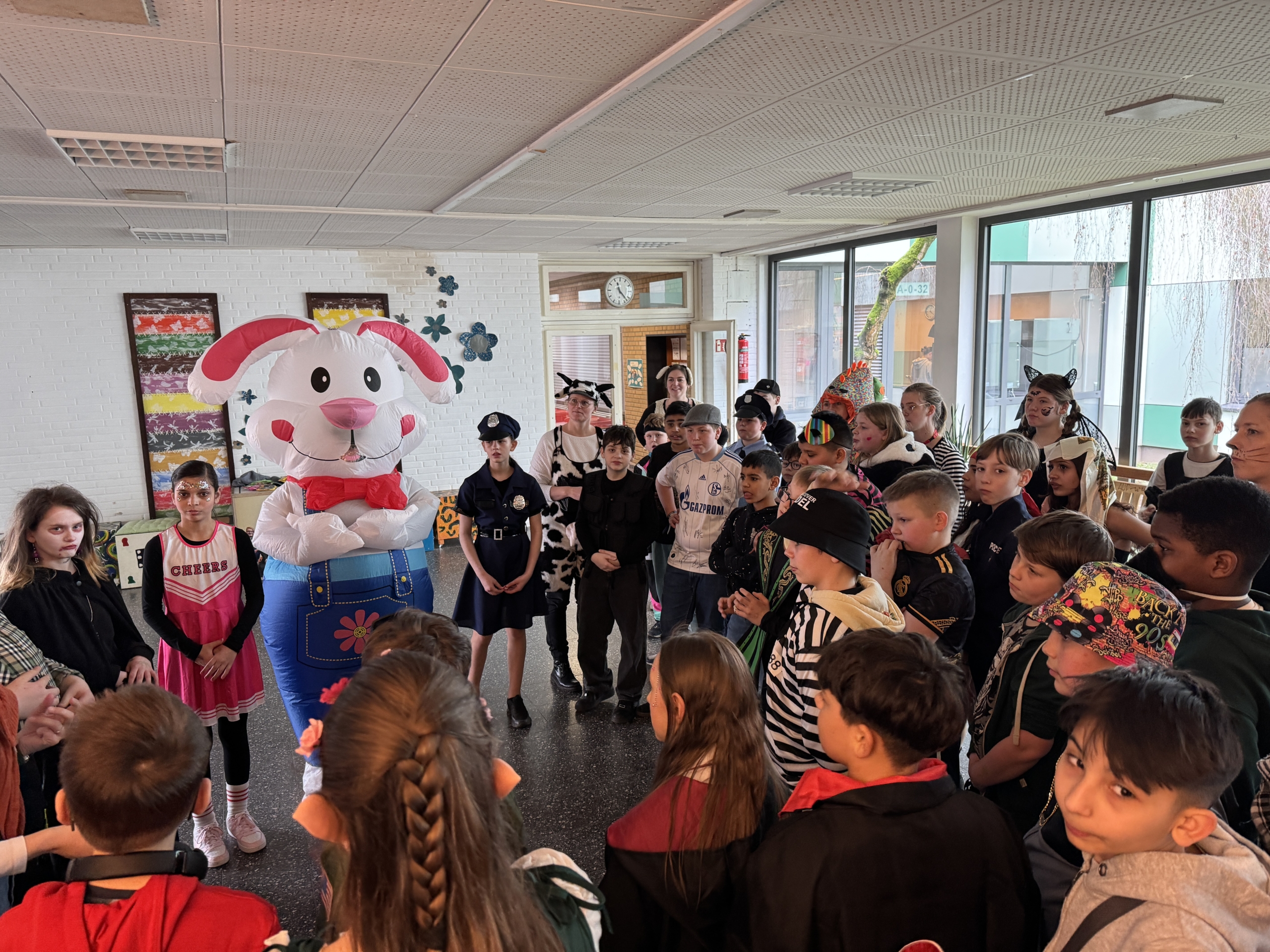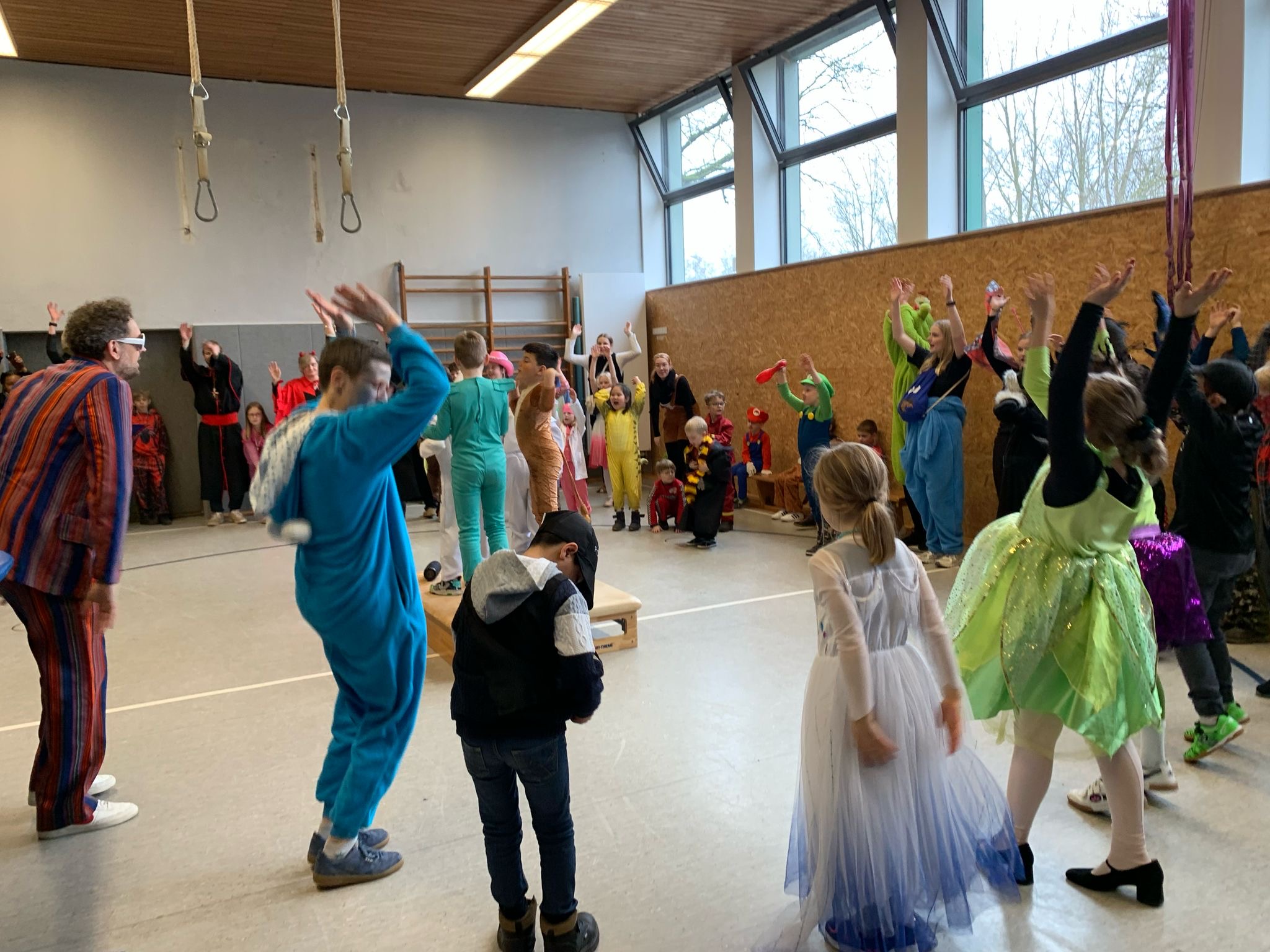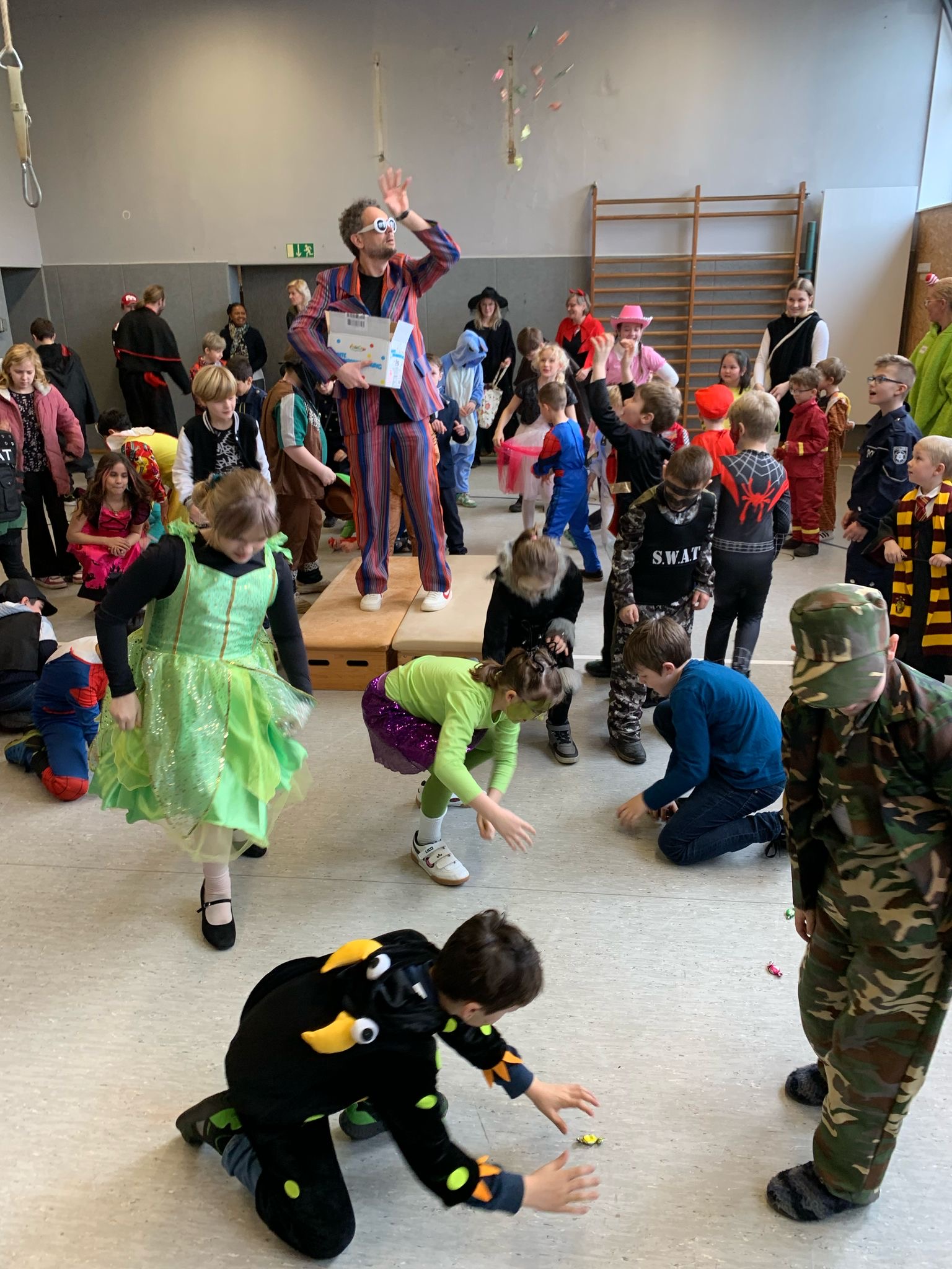 Ein besonderes Highlight des Tages war die große Polonaise, die sich durch die gesamte Schule schlängelte. Mit lauter Musik und viel Freude zogen die Kinder gemeinsam mit den Lehrkräften durch die Gänge und verbreiteten eine mitreißende Karnevalsstimmung.