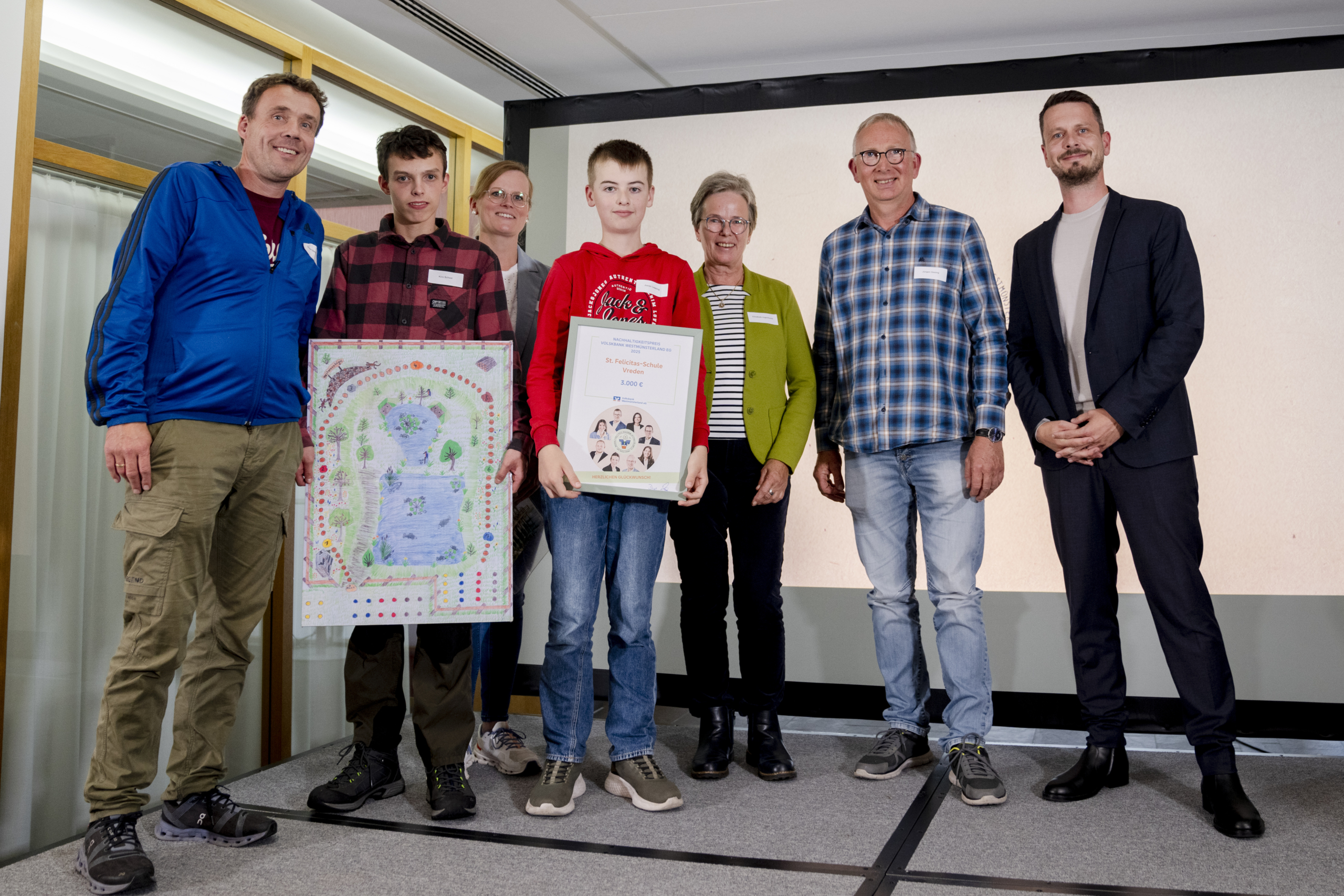 Den Preis nahm Frau Elisabeth Ingenhorst, 1. Vorsitzende des Fördervereins, entgegen. Begleitet wurde sie von Stefan Becking und Jürgen Gesing, die maßgeblich an der Gestaltung unserer außerschulischen Lernorte wie Schulgarten, Biotop und Waldlehrpfad beteiligt sind. Ebenso dabei war Frau Lena Sendfeld, Klassenlehrerin von zahlreichen Schüler*innen, die aktiv in die Projekte eingebunden sind.