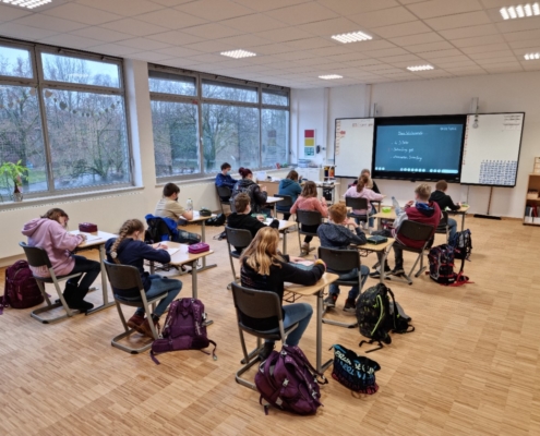 Bereits im Oktober starteten die lang erwarteten Renovierungsarbeiten an der St. Felicitas-Schule. Zunächst wurden im alten Hauptgebäude einige Klassenräume renoviert, die schon während der Weihnachtsferien bezogen werden konnten. Auf dem Foto freuen sich die Schüler*innen der Klassen 4a, 4b und 6b über ihre tollen neuen Klassenräume und die neuen digitalen Tafeln.